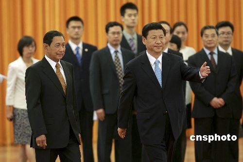 6月16日,中国国家副主席习近平在北京人民大会堂举行仪式,欢迎缅甸国家和平与发展委员会副主席貌埃(前左)访华。中新社发 盛佳鹏 摄
