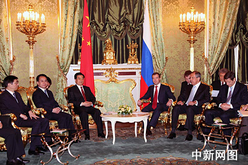 正在俄罗斯进行国事访问的中国国家主席胡锦涛,当地时间十七日中午在克里姆林宫与俄罗斯总统梅德韦杰夫举行会谈。 中新社记者 齐彬 摄
