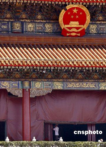 6月29日,工作人员在北京天安门城楼修缮工程现场施工,城楼梁柱等已粉刷一新。据悉,此次天安门城楼修缮工程主要以梁柱、屋顶等部位的重新粉刷和彩绘为主,将以崭新的面貌迎接新中国成立60周年。中新社发 郑雄增 摄