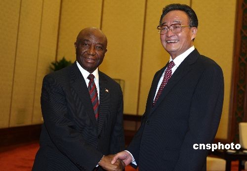7月10日下午,中国全国人大常委会委员长吴邦国在北京人民大会堂会见利比里亚共和国副总统约瑟夫·尼乌马·博阿凯。约瑟夫·尼乌马·博阿凯副总统是应中国国家副主席习近平的邀请,于7月5日至11日对中国进行正式访问。中新社发 任晨鸣 摄