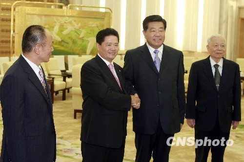 7月27日,全国政协主席贾庆林在北京人民大会堂会见以郑铭坤(左二)先生为团长的台湾妈祖联谊会代表团。中新社发 盛佳鹏 摄