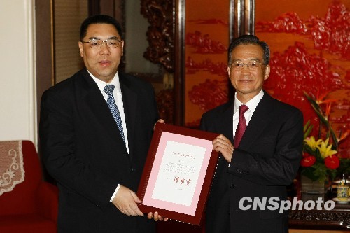 8月11日,中国国务院总理温家宝在北京中南海紫光阁向崔世安颁发任命他为中华人民共和国澳门特别行政区第三任行政长官的国务院令。中新社发 盛佳鹏 摄