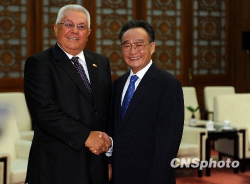 8月17日,中国全国人大常委会委员长吴邦国在北京人民大会堂会见克罗地亚议会议长贝比奇。中新社发 廖攀 摄