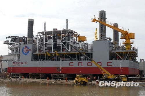 中国第一座自升式海上采油平台——中海油自安装采油平台近日在山东东营胜利油田油建公司桩西海工建造基地顺利下水,正式进入运行调试阶段。这座自升式采油平台总重量达五千五百吨,主体采用长六十米、宽三十五米的箱体结构,具有原油生产处理、储存和外输等功能。据了解,这座自升式采油平台按计划将在十月底投产,并首先应用于中国渤海海域一千五百万方储量以下小油、气构造的开采,投产后将会极大降低在我国广泛分布的浅海边际油田的开发成本。中新社发 洪彬 摄