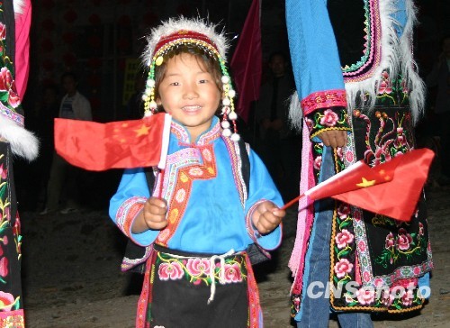 9月28日晚,“迁新居·迎国庆”5.12大地震失地群众异地安置联欢晚会在四川邛崃市南宝山安置点隆重举行。图为四川地震灾区儿童手执红旗喜迎国庆。中新社发 霍潺 摄