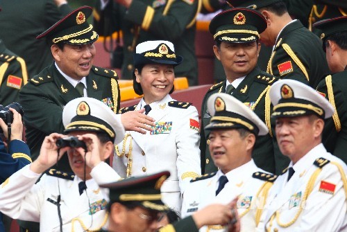 2009年10月1日,中华人民共和国成立60周年庆祝大会开幕前,将军们在观礼台上笑逐颜开。 中新社发 杜洋 摄
