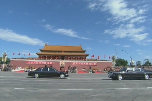 2009年10月1日,中华人民共和国成立60周年庆祝大会在北京天安门广场举行。中共中央总书记、国家主席、中央军委主席胡锦涛在天安门广场阅兵。(电视截图)