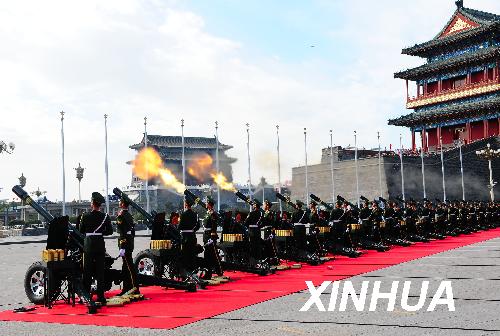 10月1日,首都各界庆祝中华人民共和国成立60周年大会在北京举行。这是国庆庆典礼炮在天安门广场鸣响。任勇 摄