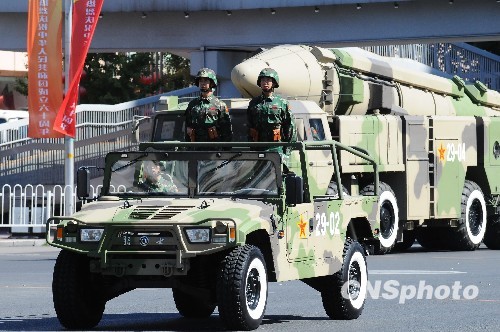 10月1日上午,中华人民共和国成立60周年庆祝大会在北京举行。图为东风21丙常规导弹部队军车通过长安街。中新社发 侯宇 摄