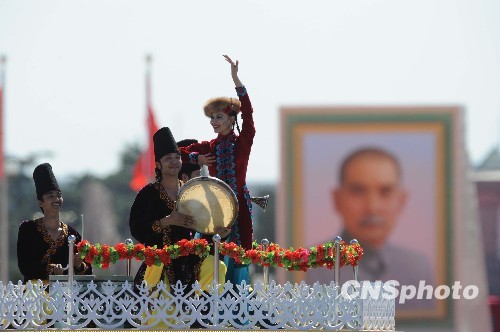 10月1日,中华人民共和国成立60周年庆祝大会在北京举行。图为新疆彩车亮相群众游行队伍。中新社发 廖攀 摄
