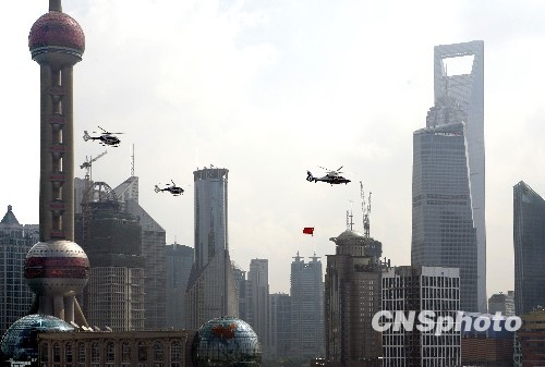 10月2日,上海市公安局警务航空队派出了三架警用直升机,悬挂一面五星红旗,在外滩上空以“品”字型编队巡展飞行。这是继香港政府飞行队之后,第二支国庆期间挂国旗飞行的国内飞行队。为确保巡展活动的安全、有序,上海专门聘请香港政府飞行队的专家来沪培训了直升机悬挂国旗巡展飞行方法,并多次组织飞行员、空中任务员进行了地面模拟协同训练和试航。中新社发 潘索菲 摄