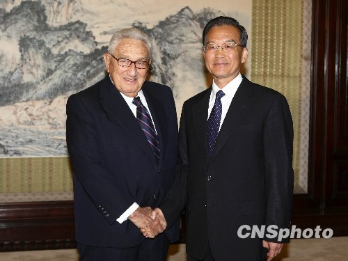 10月12日,中国国务院总理温家宝在北京中南海紫光阁会见出席中美“二轨”高层对话的美方主席、美国前国务卿基辛格、舒尔茨、前国防部长佩里、前财政部长鲁宾等美方代表。中新社发 盛佳鹏 摄