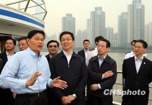10月13日,上海世博会开幕倒计时200天,上海市委副书记、市长韩正(左二)专门视察上海黄浦江两岸市容环境综合整治情况,希冀在2010年上海世博会开幕前,呈现给观众一个整洁、有序、美观的沿岸景观。中新社发 潘索菲 摄