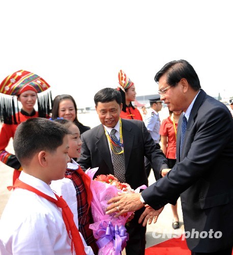 10月18日中午,老挝总理波松飞抵广西南宁国际机场,出席将于20日开幕的第六届中国—东盟博览会,在机场波松受到当地民众的热烈欢迎。中新社发 蒋雪林 摄