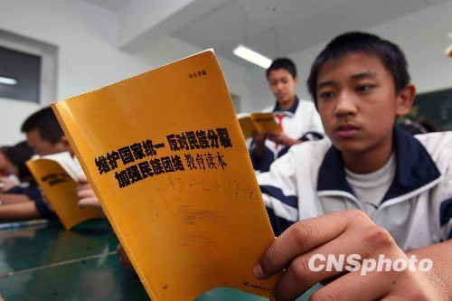 由国家教育部和国家民委组织专家编写的包括《中华大家庭》、《民族常识》、《民族政策常识》和《民族理论常识》等内容的民族团结系列教材,本月开始统一向新疆乌鲁木齐市各中小学发放。该系列教材读本结合大量生动、贴近生活的实例,从民族凝聚力、民族团结和反对民族分裂等各方面进行讲述和教育,更加的通俗易懂。图为该市第66中学的初中课堂上,学生们正在认真阅读民族团结教育读本。中新社发 刘新 摄