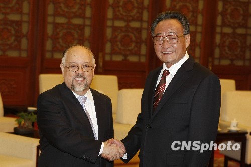 10月21日,中国全国人大常委会委员长吴邦国在北京人民大会堂会见哥斯达黎加民族解放党主席、议长弗朗西斯科·帕切科。中新社发 盛佳鹏 摄