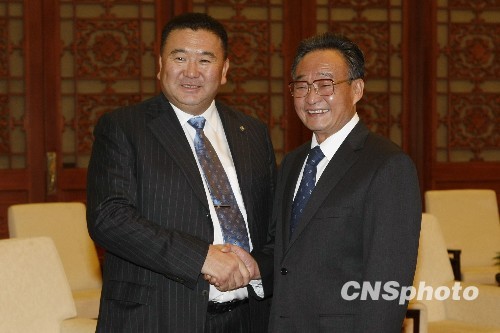 10月27日,全国人大常委会委员长吴邦国在北京人民大会堂会见了蒙古国家大呼拉尔副主席、蒙中议员小组主席嘎瓦·巴特呼一行。中新社发 盛佳鹏 摄