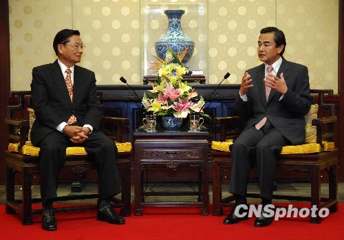 10月29日,中共中央台办、国务院台办主任王毅(右)在北京钓鱼台国宾馆会见了台湾海基会董事长江丙坤率领的海基会新闻交流团一行。中新社发 侯宇 摄