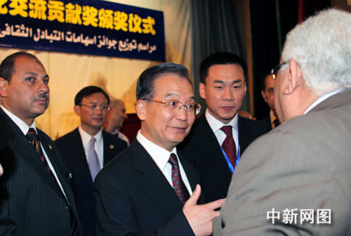 埃及当地时间十一月七日上午,正在对埃及进行正式访问的中国总理温家宝来到开罗中国文化中心,为九位“中埃文化交流贡献奖”获得者颁奖。多位获奖者都是用中文与温家宝交谈。张朔 摄