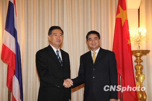 中共中央政治局委员、中共广东省委书记汪洋11月8日晚率团抵达曼谷并展开为期4天的友好访问,当地时间9日上午8时泰国总理阿披实(右)在总理府会见了汪洋(左)一行。据悉,汪洋此行将注重加强广东省与泰国的经贸投资、农业及观光等领域合作。泰国总理阿披实于今年6月访问广州市,并与汪洋进行过会晤,双方将推动上次会晤时所取得的成果进一步具体实现。同时,汪洋将亲自邀请阿披实总理参加明年11月的广州亚运会的开幕仪式。中新社发 顾时宏 摄