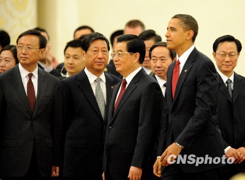 11月17日上午,中国国家主席胡锦涛在北京人民大会堂举行仪式,欢迎美国总统奥巴马访华。图为胡锦涛向奥巴马介绍中方官员。中新社发 廖攀 摄