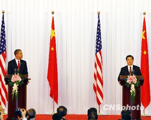 11月17日中午,中国国家主席胡锦涛与到访的美国总统奥巴马在北京人民大会堂会谈后共同会见记者。中新社发 任晨鸣 摄