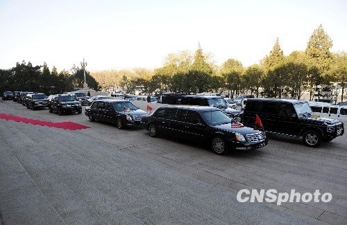 11月17日上午,美国总统奥巴马访华车队停靠在北京人民大会堂外。当日,中国国家主席胡锦涛在人民大会堂北大厅举行仪式,欢迎美国第44任总统奥巴马对中国进行国事访问。中新社发 廖攀 摄