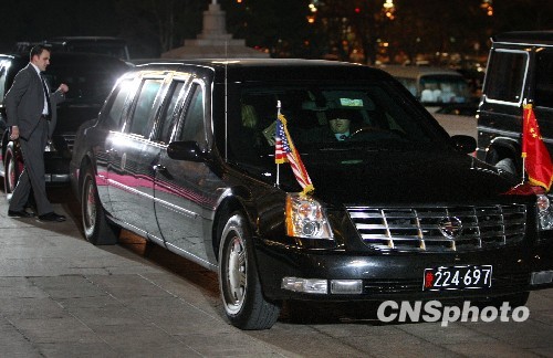 11月17日晚,美国总统奥巴马前往北京人民大会堂出席中国国家主席胡锦涛的欢迎宴会时,从美国乘坐总统专机而来的凯迪拉克防弹车在美方保安的保卫下在人民大会堂外待命。中新社发 任晨鸣 摄
