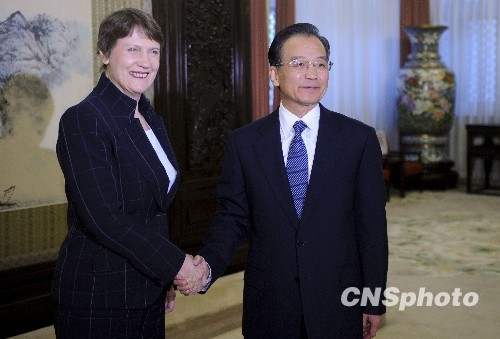 11月26日,中国国务院总理温家宝在北京中南海紫光阁会见了联合国开发计划署署长海伦·克拉克一行。中新社发 廖攀 摄