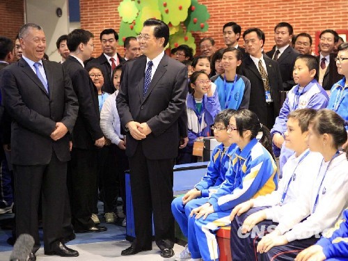 十二月十九日下午,国家主席胡锦涛在澳门首何厚铧陪同下参观澳门科学馆,并与当地学生亲切交流。中新社发 张勤 摄