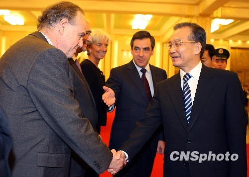 12月21日傍晚,中国总理温家宝在北京人民大会堂举行仪式欢迎法国总理菲永访华,菲永总理向温家宝介绍陪同其访华的随行官员。中新社发 任晨鸣 摄