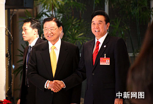 12月22日上午,第四次两岸两会领导人会谈在台中市裕元酒店4楼温莎广场举行,图为海基会董事长江丙坤在会场门口迎接陈云林。 中新社记者 陈立宇 摄