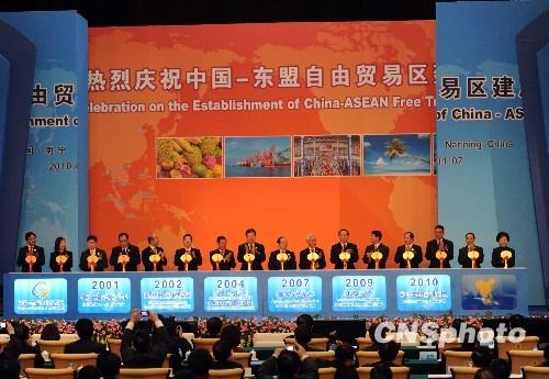 1月7日,中国—东盟自由贸易区建成庆祝仪式在南宁举行。全国政协副主席黄孟复宣布仪式开始,与会嘉宾用金钥匙共同开启自贸区合作大门。中国商务部副部长易小准、东盟副秘书长孙达姆、老挝副总理宋沙瓦·凌沙瓦、二OO七年诺贝尔经济学奖获得者埃里克·马斯金等数百位嘉宾出席庆祝仪式。中新社发 蒋雪林 摄