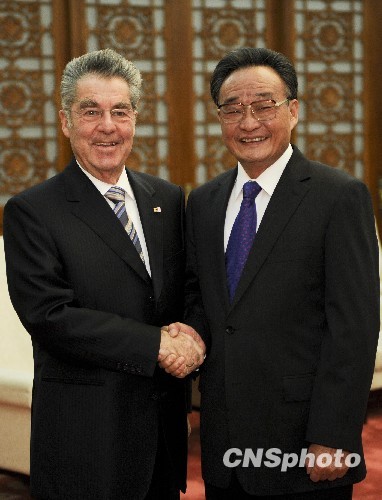 1月21日,中国全国人大常委会委员长吴邦国在北京人民大会堂会见了奥地利总统菲舍尔一行。中新社发 廖攀 摄