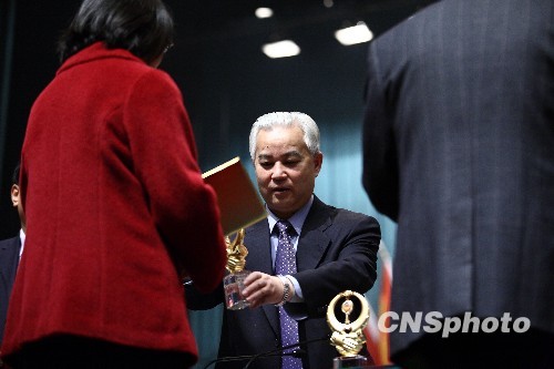 1月25日举行的政协四川省十届三次会议的第二次全体会议上,四川省政协表彰了包括《尽快建设灾区生活必需品应急市场的建议》、《关于灾后住宅重建的提案》等十届一次会议以来的110件优秀提案。图为四川省政协主席陶武先为优秀提案代表授奖。中新社发 张浪 摄