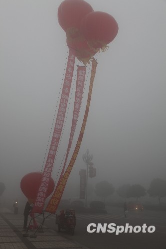 1月25日上午,工作人员在眉山东坡广场回收彩球。当日,四川眉山市遭遇大雾,成(都)乐(山)高速公路全线长时间关闭,给人们的出行带来不便。中新社发 尧遥 摄