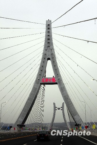 2月10日,洛阳首座双塔双索面斜拉式凌波大桥剪彩通车。这座大桥的命名既充满曲折又体现民意。因与孙辛路相连,凌波大桥在始建之初,被命名为孙辛大桥,这个名字一度引起了洛阳人尤其是洛阳网友的热议,“凌波桥”一时间成了网议热点。2008年5月26日,在网友们的推动下,孙辛桥被正式命名为洛河凌波大桥。该大桥主桥为双幅式大桥,自2008年1月开工,全长2345米,其中主桥长1256米,南北引线长1089米,宽度65米,工程预算投资2.3亿元。中新社发 张晓理 摄