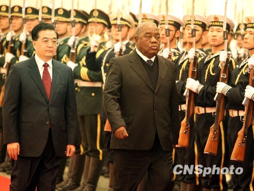 2月25日傍晚,中国国家主席胡锦涛在北京人民大会堂举行仪式,欢迎赞比亚共和国总统鲁皮亚·布韦扎尼·班达访华。鲁皮亚·布韦扎尼·班达是应胡锦涛的邀请,从2月24日至3月4日对中国进行国事访问。中新社发 任晨鸣 摄