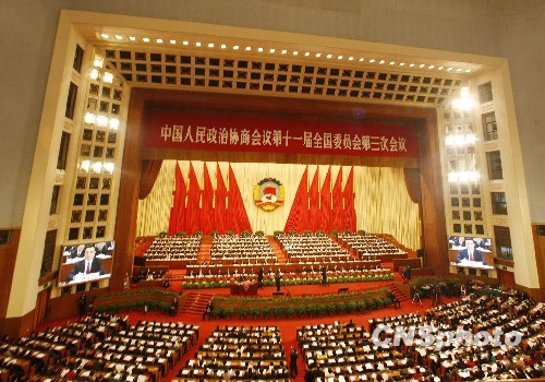 3月3日下午,全国政协十一届三次会议在北京人民大会堂开幕,全国政协主席贾庆林作全国政协常委会工作报告。中新社发 任晨鸣 摄