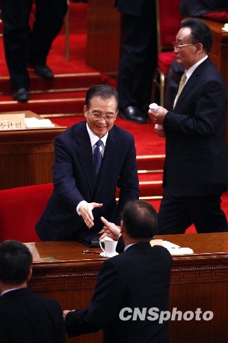 3月3日,全国政协十一届三次会议在北京人民大会堂开幕。温家宝会后与委员握手。中新社发 杜洋 摄