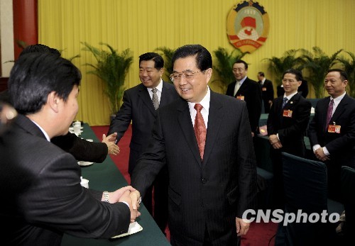 3月4日,中国国家主席胡锦涛、全国政协主席贾庆林来到全国政协民建、工商联委员联组讨论现场,与委员们共商国是,并听取部分委员发言。中新社发 廖攀 摄