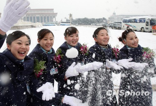 3月8日,正值“三八”妇女节一百周年,服务于全国两会的礼仪小姐在天安门广场上演绎雪中浪漫,庆祝“三八”节。中新社发 汤彦俊 摄
