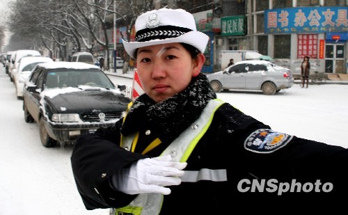3月8日是“三八”妇女节,山西省忻州市街头女民警身着戎装在雪中指挥交通,用自己的劳动喜庆妇女节的到来。中新社发 蔡增乐 摄