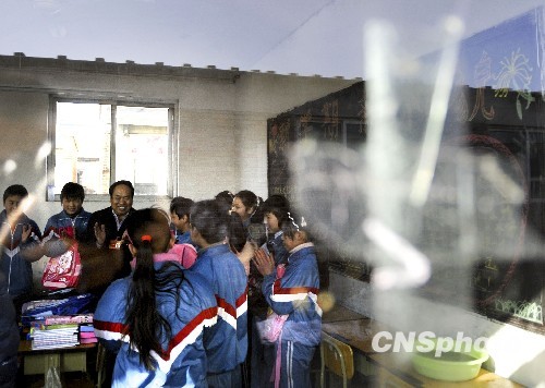 3月9日,透明胶条粘合着玻璃裂纹的平房教室内,甘连舫委员与民工子弟学校的学生交流。当日,全国政协委员甘连舫到北京市石景山区台京学校,看望师生并了解办学情况。中新社发 廖攀 摄