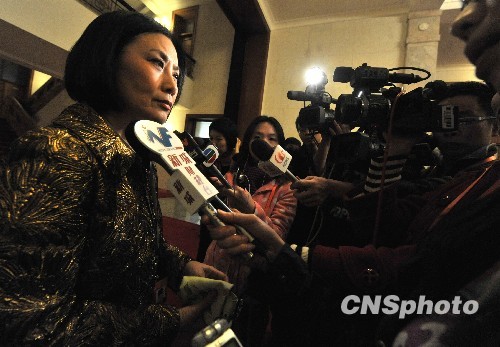 全国政协委员、香港著名艺人汪明荃3月11日在北京参加全国政协十一届三次会议时,被港澳媒体堵在洗手间外,她表示对亚洲电视的人事等传闻概不知情。中新社发 贾国荣 摄