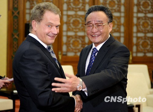 3月29日,中国全国人大常委会委员长吴邦国在北京人民大会堂会见了芬兰议长尼尼斯托。中新社发 廖攀 摄