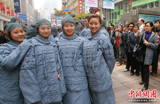 4月10日,由西安旅游局承办的兵马俑牵手上海世博会大型旅游宣传咨询活动举行。来自兵马俑故乡的百人表演队伍,身着灰色的兵马俑服装,以铿锵的节奏、雄壮的气势,在上海南京东路步行街和东方明珠广场游演,吸引了大批市民及海内外游客驻足观看。