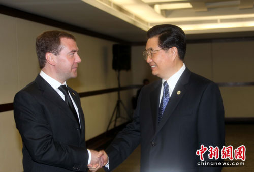 当地时间4月15日下午,中国国家主席胡锦涛在巴西利亚下榻饭店会见俄罗斯总统梅德韦杰夫。胡锦涛说,今天是我们本年度第一次见面,今后还有多次双边和多边见面的机会。梅德韦杰夫对中国青海玉树遭受地震灾害表示慰问。他表示,如果友好邻邦中国有什么需要,我们愿意提供任何支持。中新社发 张朔 摄