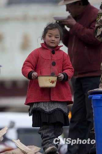 4月16日,青海玉树格萨尔王广场,一名小姑娘正在领取免费供应的食品。中新社发 盛佳鹏 摄
