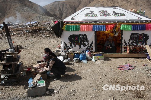 2010年4月16日,青海玉树藏族自治州玉树县结古镇,一户已搬到帐篷内的市民正在准备饭菜。中新社发 盛佳鹏 摄